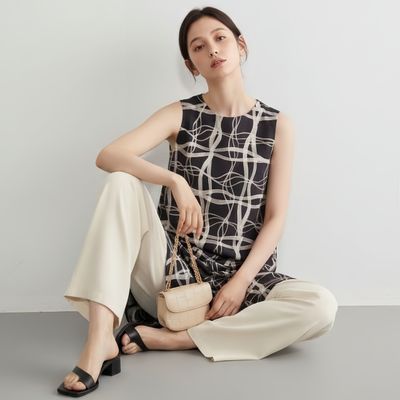 抽象ナミナミ格子柄ノースリーブ背中タックチュニック・ワンピース