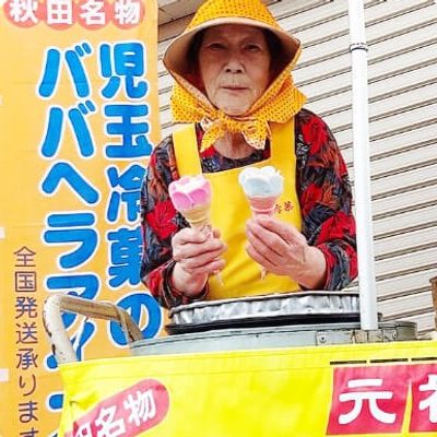 先代児玉正吉が考案してアイスキャンディーを自転車の荷台に乗せて売りに歩いたのが始まりです。 アイスは丸い缶に入れて、赤(ピンク)色(いちご味)、黄色(バナナ味)の2色を作り、そのアイスと同じ色のパラソルを立てて、県内の国道や県道沿いで販売しておりました。 現在はお祭りやイベント会場などで売り子さん(おばあちゃん)がアイスクリームを盛るという販売形態で秋田の夏の風物詩となっています。 売り子さん(おばあちゃん)がヘラでアイスを盛ることから名付けられ、児玉冷菓のババヘラアイスとして、販売しております。 2色のアイスクリームは創業当時と変わらずシャーベット状でシャリシャリ感と独特の舌ざわり、素朴な味で皆さまに喜ばれております。