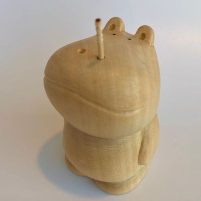 ようじが出てメモもくわえる木彫りのカバ