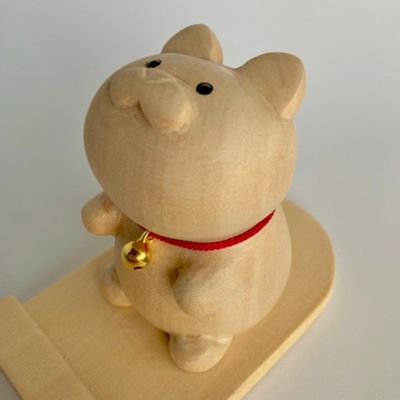スマホスタンドになる木彫りの鈴ネコ